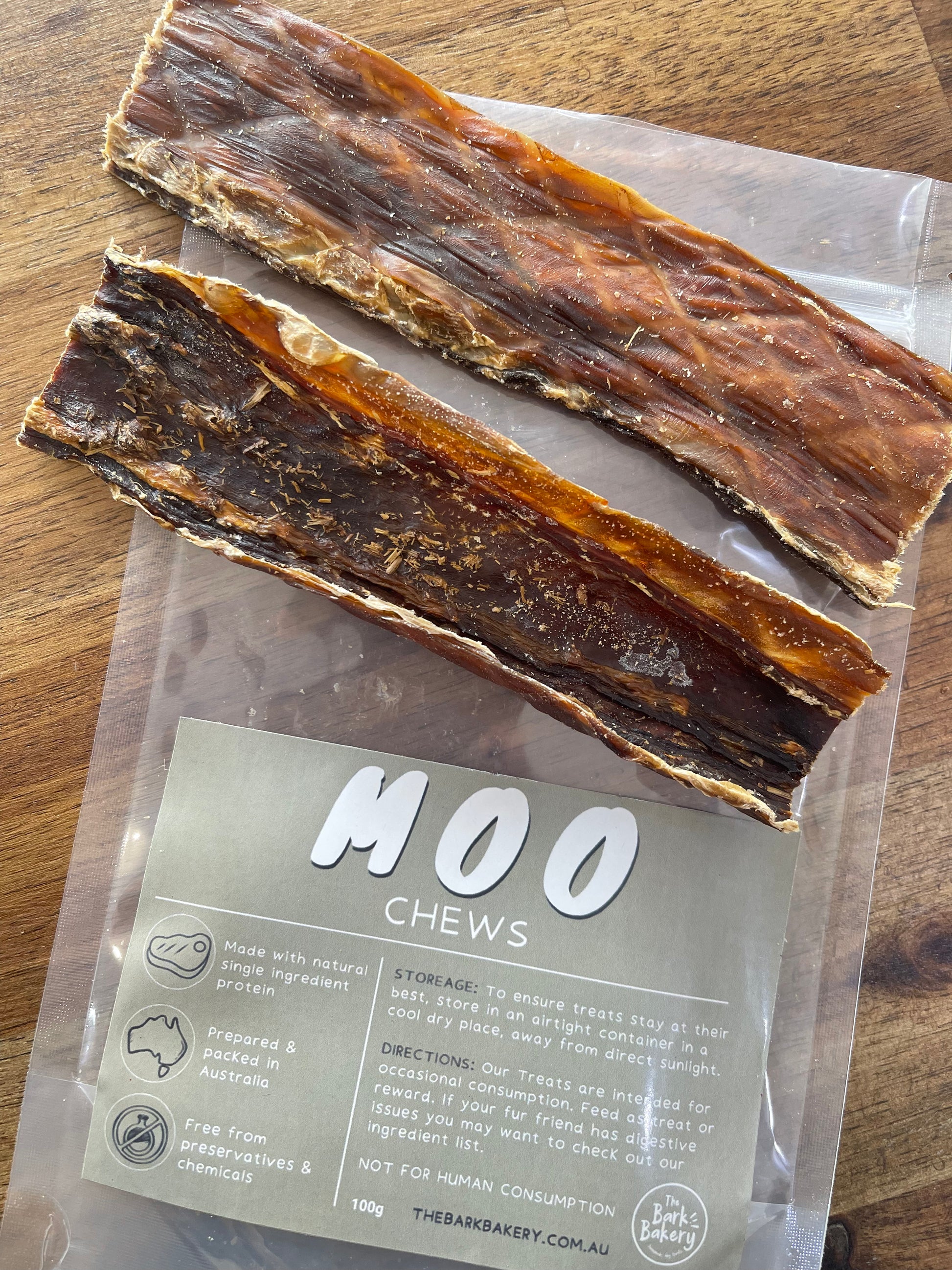 Our Moo Chews are all-natural Jerky with no added preservatives. They come in long strips and can be broken down into smaller bite-size pieces. Suitable for dogs of all sizes.